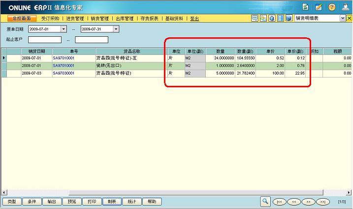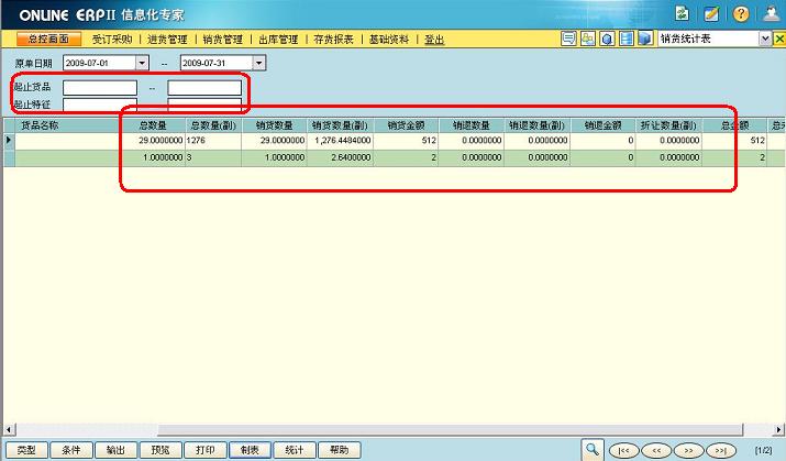 二、在统计表中凡是有数量栏位,且【类型】有选择依货品的,都增加了相应的副数量栏位,是根据货品所设置的公式,由主单位数量推算出,如下图的【销货统计表】:
