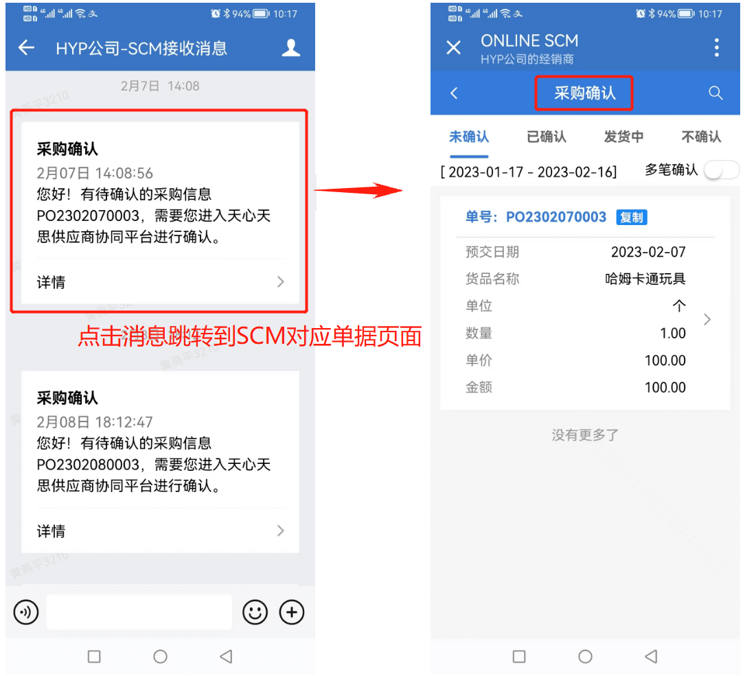 五、供应商用户收到SCM消息,点击消息可跳转到SCM对应单据页面,如下图:
