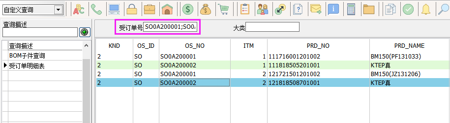 语句: DECLARE @OS_NO varchar(100),@KND varchar(50) SET @OS_NO = :Z01!受订单号;--定位到自定义查询受订单号多选查询视窗的代号:Z01 SET @KND = :Z02!大类;--定位到自定义查询货品大类多选查询视窗的代号:Z02 SELECT B.KND,A.* FROM TF_POS A LEFT JOIN PRDT B ON A.PRD_NO = B.PRD_NO WHERE OS_ID = 'SO' AND (CHARINDEX(';'+A.OS_NO+';',';'+@OS_NO +';')>0 OR ISNull(@OS_NO,'') = '') AND (CHARINDEX(';'+B.KND+';',';'+@KND +';')>0 OR ISNull(@KND,'') = '') 效果图: